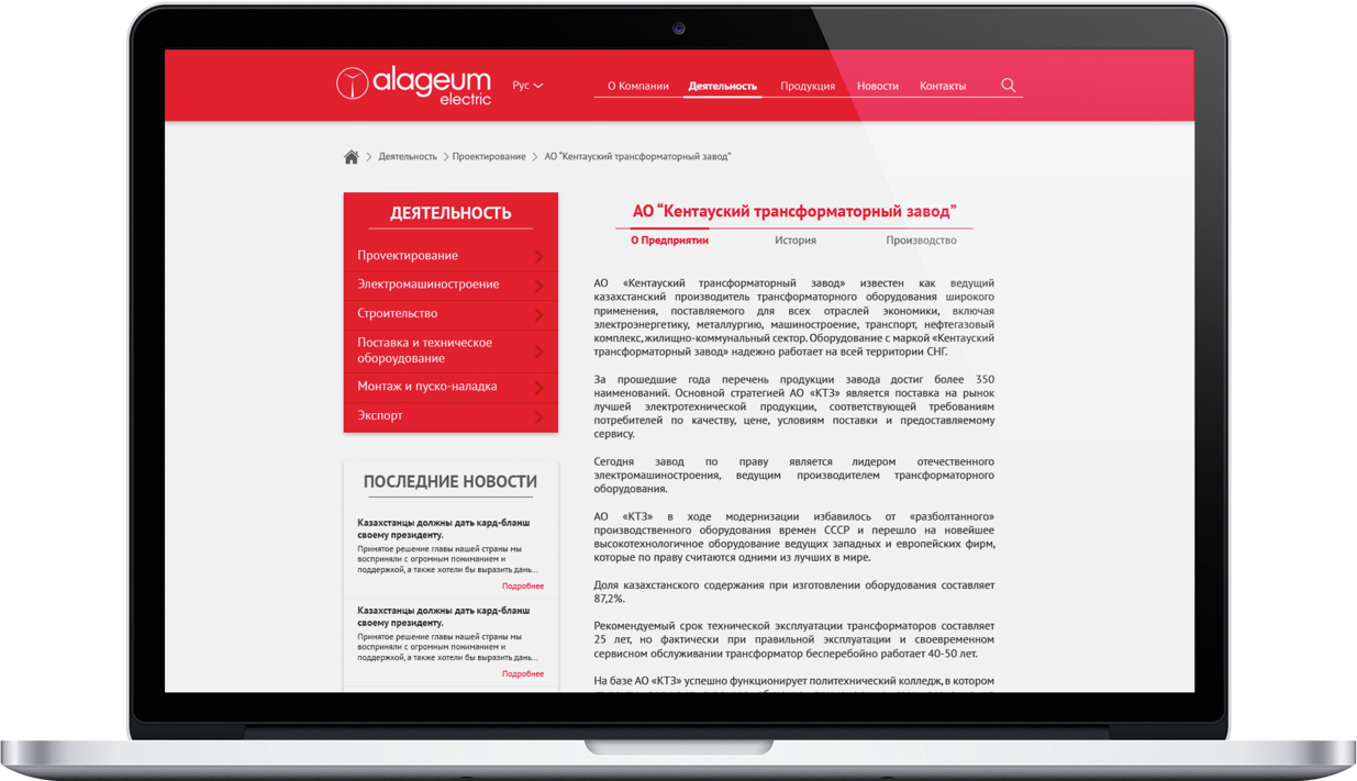 «Alageum Electric» – крупнейшая электротехническая компания Казахстана, включает в себя более 30-ти крупных предприятий и заводов, успешно действующих в сфере электроэнергетики, электромашиностроения и строительства.