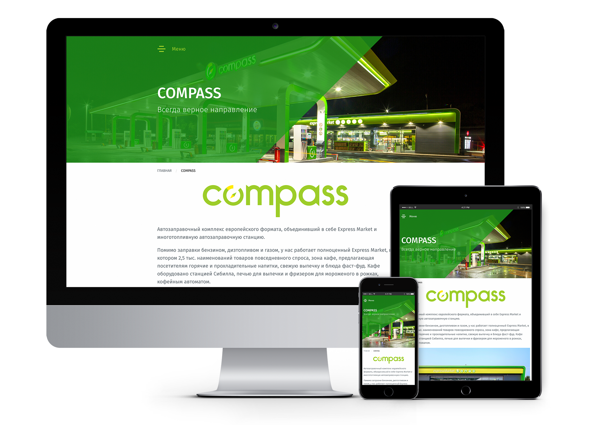 The Compass brand is developed in Kazakhstan. The idea of the filling format is borrowed from the European experience, where such complexes are already a common thing. It took us a long time to find a suitable store concept, purchase spacious plots of land, embody the design of the exterior and store interior into a working complex.